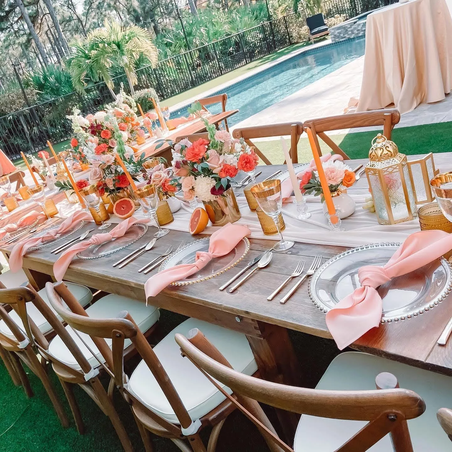 Complement your aesthetic with table and chair rentals that reflect your theme, whether it's a chic garden party or a cozy family gathering.